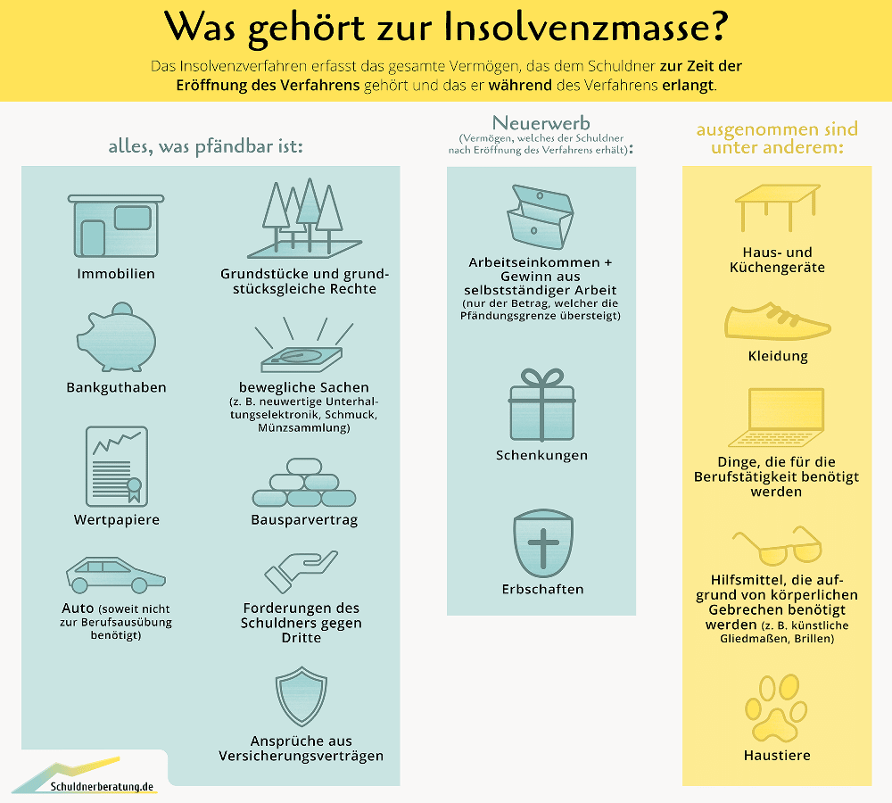 Welche Gegenstände und sonstige Vermögenswerte der Schuldner während der Verbraucherinsolvenz herausgeben muss und welche er behalten darf, zeigt die folgende Infografik zur Insolvenzmasse.